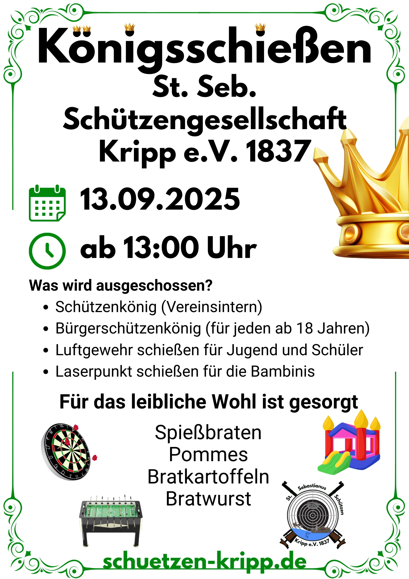 Kripp. Am Samstag, 13. September 2025, lädt die St. Seb. Schützengesellschaft Kripp e.V. 1837 zum traditionellen Königsschießen auf das Vereinsgelände im Batterieweg 52–54 in Kripp ein. Beginn ist um 13:00 Uhr – ein Tag voller sportlicher Spannung, Unterhaltung und gelebtem Brauchtum erwartet die Gäste. Der barrierefreie Zugang erfolgt bequem über den Sandweg.